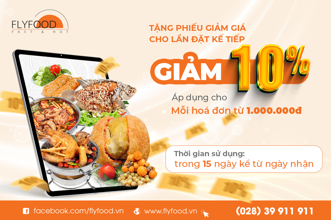 🌟FLYFOOD - thương hiệu ẩm thực Việt dành tặng đến quý khách hàng Ưu đãi "TẶNG PHIẾU GIẢM GIÁ 10%" khi đặt hàng tại FLYFOOD. Chương trình áp dụng cho đơn hàng từ 1.000.000 đồng, quý khách hàng được tặng một phiếu giảm giá 10% cho lần đặt hàng kế tiếp.