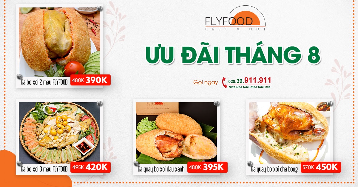 Cùng với đó là sứ mệnh hơn 8 năm hình thành và phát triển của mình, giờ đây FLYFOOD đã và đang từng ngày nỗ lực, tìm tòi để đưa những giá trị của ẩm thực truyền thống Việt đến với khách hàng. Mỗi món ăn chính là sự tâm huyết, tỉ mỉ và là một món quà của FLYFOOD dành cho khách hàng. Vì vậy, FLYFOOD tổ chức chương trình khuyến mãi cho các món ăn như sau: